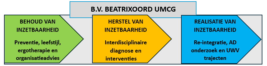 B.V. Beatrixoord heeft als doel gezonde duurzame participatie in werk van medewerkers in Noord-Nederland. We werken samen met het UMCG Centrum Voor Revalidatie en richten ons primair op participatie in werk. Vanuit Haren en Groningen bieden we interdisciplinaire diagnostiek, – interventies en begeleiding bij re-integratie. Een deel van deze dienstverlening leveren we ook in Friesland en Drenthe. Op het terrein van leefstijl en ergotherapie bieden we preventieve diensten in het noorden. En wij zijn trots lid van het landelijke netwerk Vroege Interventie Coöperatie U.A.
